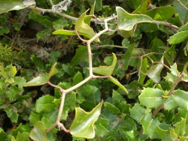De resto, as folhas são pecioladas e posicionam-se de forma alterna nos caules; são inteiras, com acúleos na margem e ocasionalmente apresentam manchas brancas; a sua consistência coriácea ajuda a planta a poupar as suas reservas de água e nutrientes através da redução da transpiração.