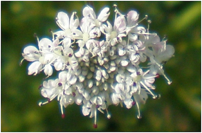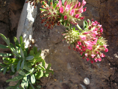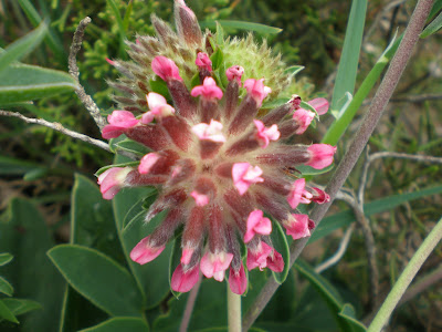 As flores, reunidas em pequenos cachos, são branco-rosadas com a ponta vermelha ou púrpura. São muito pequenas, alongadas e apresentam quatro pétalas irregulares e unidas, com prolongamento oco e cilíndrico.