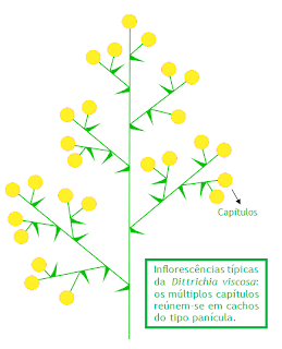 As inflorescências da Dittrichia viscosa têm cerca de 2 cm de diâmetro. As flores que as compõem, entre 40 a 60, de dimensão muito reduzida e de cor amarelo brilhante, agrupam-se de forma muito compacta sobre um receptáculo em forma de disco. As flores da periferia deste disco são liguladas, isto é, apresentam um prolongamento para o exterior em forma de pétala a que se chama lígula. As flores liguladas, entre 10 a 16, são estéreis e têm como única função “alindar” o conjunto, para atrair os insetos polinizadores. As flores do centro do disco são tubulares e possuem órgãos reprodutores femininos e masculinos. Apesar de pouco vistosas são elas que asseguram a perpetuação da espécie, concentrando as suas energias na produção de sementes. De modo geral, a auto-polinização é evitada, porque quando os órgãos reprodutores femininos de um capítulo amadurecem, já o pólen do mesmo foi levado pelos insetos para outros indivíduos da mesma espécie, por terem os órgãos masculinos amadurecido mais cedo.