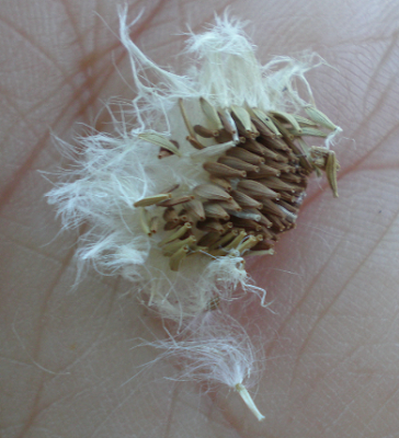 Cada flor produz um fruto cilíndrico (cipsela) que se assemelha a uma pequena bola fofa esbranquiçada. Esta é composta por um grupo de sementes de cor acastanhada que tem um papilho de cerca de 15 sedas suaves, no topo. Cada semente tem cerca de 2mm de comprimento e o papilho cerca de 5 mm de comprimento. Estima-se que cada planta de tamanho médio poderá produzir uma media de 600 a 700 flores por ano, cada uma dando origem a cerca de 50 sementes viáveis, sendo pois, plantas muito prolíferas.