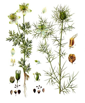 As sementes de N. sativa são conhecidas pelo nome comum de cominho preto embora nada tenham a ver com o nosso conhecido cominho