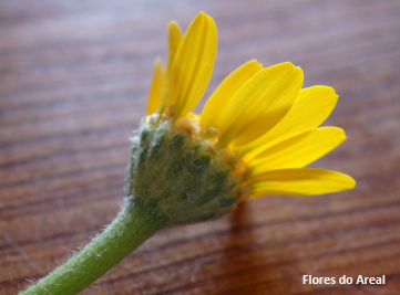 inflorescências do tipo capítulo, característica comum entre os malmequeres e que nesta espécie surgem solitários no topo de pedúnculos longos e eretos, despidos de folhas.
