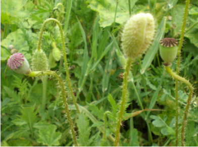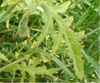 Os frutos são cípselas de cor acastanhada, oblongas, encurvadas e sem papilho (tufo de pelos) mas glandulosos na base.