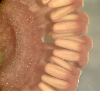 Corte longitudinal de estróbilo de Equisetum arvense Podem observar-se os esporângios suspensos dos esporangióforos e as hastes que ligam estes ao eixo Fonte: Wikipedia - Foto de Keisotyo |